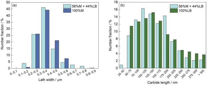 Martensitic lath size distributions in the 100%M and LB/M (56%M + 44%LB) samples (a), and bainitic carbide size distributions in the LB/M (56%M + 44%LB) and 100%LB samples (b)