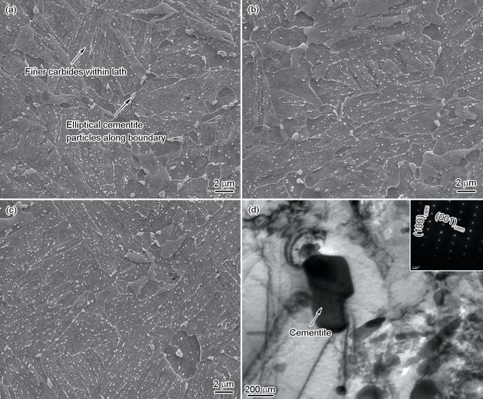 SEM images of 100%M (a), LB/M (56%M + 44%LB) (b), and 100%LB (c) samples; and TEM image and SAED pattern (inset) of elliptical inter-lath cementite after tempering at 600 oC for 16 h (d)