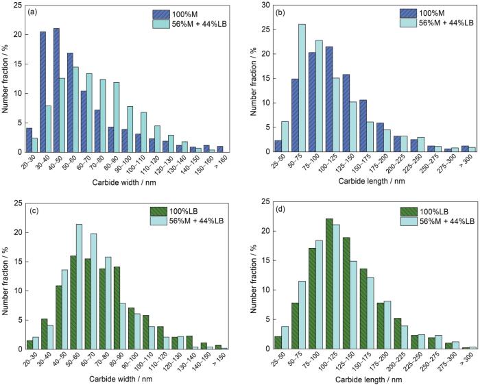 Width (a) and length (b) distributions for martensitic carbides in the 100%M and LB/M (56%M + 44%LB) samples, and width (c) and length (d) distributions for bainitic carbides in the100%LB and LB/M (56%M + 44%LB) samples after tempering at 600 oC for 16 h