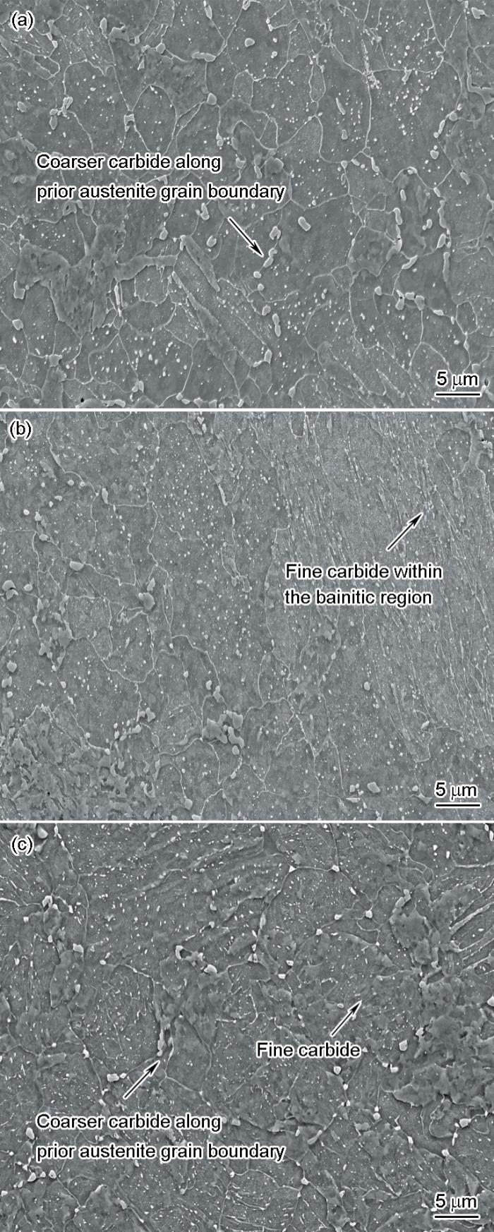 当回火时间延长至100 h时,由于回复和部分再结晶现象的发生,单一马氏体、下贝氏体和贝/马复相中的板条尺寸大大增加,甚至某些马氏体板条消失,如图8所示,此时对贝/马复相中马氏体和下贝氏体的区分,特别是马氏体和下贝氏体碳化物的区分,则相对困难。在单一马氏体中,粗大碳化物主要分布在原奥氏体晶界上,许多铁素体基体内的碳化物已溶解或者尺寸很小,出现了无碳化物区域。而在单一下贝氏体和贝/马复相中,碳化物的回火稳定性高于单一马氏体碳化物,铁素体基体内还存在小尺寸碳化物,板条结构依然清晰可见。就贝/马复相板条宽度而言,如图9a所示,由等温淬火后的0.3~0.4 μm宽度增至回火100 h后的0.6~0.7 μm宽度,最大板条宽度达1.6~1.7 μm,与单一下贝氏体内的板条宽度分布十分接近。就贝/马复相的碳化物尺寸分布而言,如图9b和c所示,贝/马复相中碳化物的尺寸分布与单一下贝氏体内碳化物的更加类似,例如,碳化物平均宽度和长度分别集中在60~80 nm和75~175 nm尺寸范围,大尺寸碳化物的数量占比均小于单一马氏体。在单一马氏体中,20%~30%原奥氏体晶界被粗大碳化物(碳化物直径可达1 μm)所覆盖,而在贝/马复相和单一下贝氏体中,仅小于10%的原奥氏体晶界被覆盖。以上均说明,在长时间回火过程中,贝/马复相中的板条和碳化物粗化行为与单一下贝氏体中的板条和碳化物粗化行为更加接近,基于此,2者的长时间回火硬度变化趋势也相对一致,与单一马氏体相差较大(图2b)。