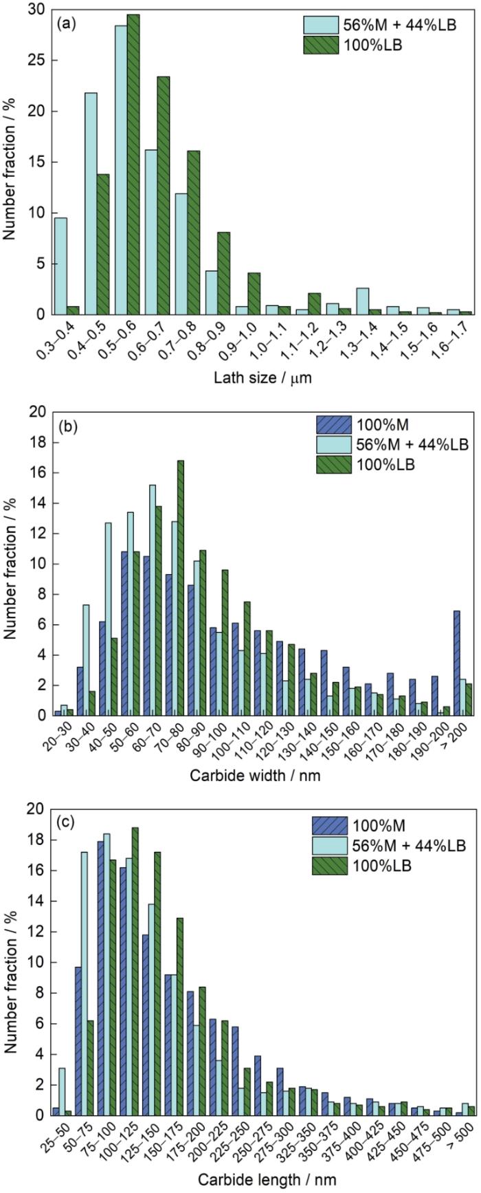Lath size distribution for the 100% LB and LB/M (56%M + 44%LB) samples (a), and the carbide width (b) and length (c) distributions for the 100%M, LB/M (56%M + 44%LB), and 100%LB samples after tempering at 600 oC for 100 h