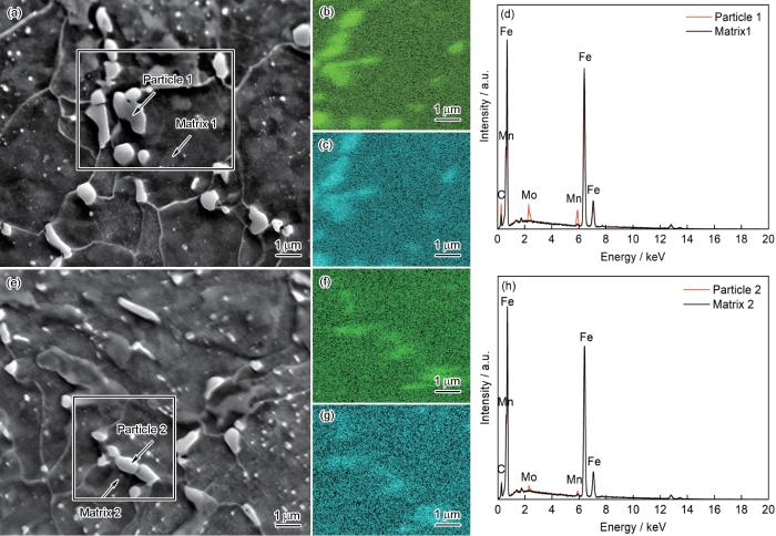 (a, e) morphologies for martensitic carbides (a) and bainitic carbides (e) (b-d) Mn (b) and Mo (c) distributions in the selected area in Fig.10a and the carbide composition (d) (f-h) Mn (f) and Mo (g) distributions in the selected area in Fig.10e and the carbide composition (h)