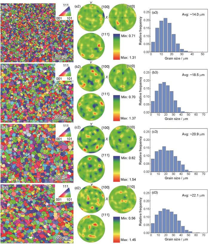 EBSD inverse pole figures (a1-d1), pole figures (a2-d2), and grain size statistics (a3-d3) of the wire-arc DED alloys under the as-deposited state (a1-a3) and as-aged at 470 oC, 4 h + 120 oC, 12 h (b1-b3), 470 oC, 4 h + 120 oC, 18 h (c1-c3), and 470 oC, 4 h + 120 oC, 24 h (d1-d3)