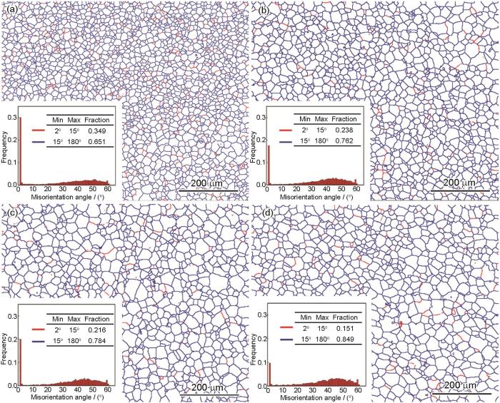 Grain boundary maps and misorientation angle statistical results (insets) of the wire-arc DED alloys under the as-deposited state (a) and as-aged at 470 oC, 4 h + 120 oC, 12 h (b), 470 oC, 4 h + 120 oC, 18 h (c), and 470 oC, 4 h + 120 oC, 24 h (d) (Red and blue grain boundaries represent low angle grain boundaries (LAGBs) and high angle grain boundaries (HAGBs), respectively)