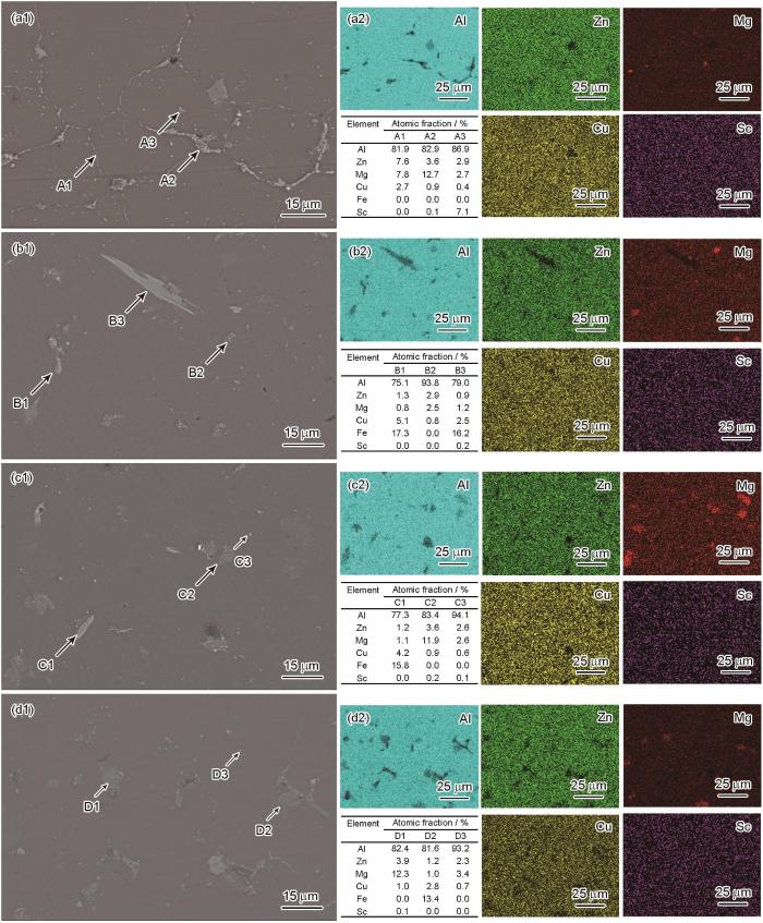 热处理后,沿晶界分布的第二相明显减少(图5b1~d1),但仍然有部分残余第二相没有在固溶处理中溶解。在经不同时间时效处理的合金中,通过一些典型第二相的EDS点扫描和面扫描可以看出,时效时间为24 h时合金没有明显出现过时效状态。不同时效工艺下,沉积合金的第二相类型相似,未溶解相主要为富Fe相和富Mg相。研究[21,31]表明,当固溶温度为470 ℃时,Zn和Mg原子的扩散速率相当,部分η(Mg(Al, Zn, Cu)2)在溶解过程中会首先转变为杂质相Al7Cu2Fe再进行溶解,且Al7Cu2Fe相的熔点较高导致溶解速率较低。因此,结合典型第二相(B1、B3、C1和D2处)含量分析可以确定富Fe相为热处理后合金的主要残余相。由于富Fe相硬度较高和界面的脆性,在受到拉伸载荷时裂纹优先在Al7Cu2Fe/Al基体界面处形核,促进了裂纹萌生,对试样延伸率产生不利影响。此外,由于T相的溶解速率非常缓慢,也会作为一部分残余第二相存在于合金中。