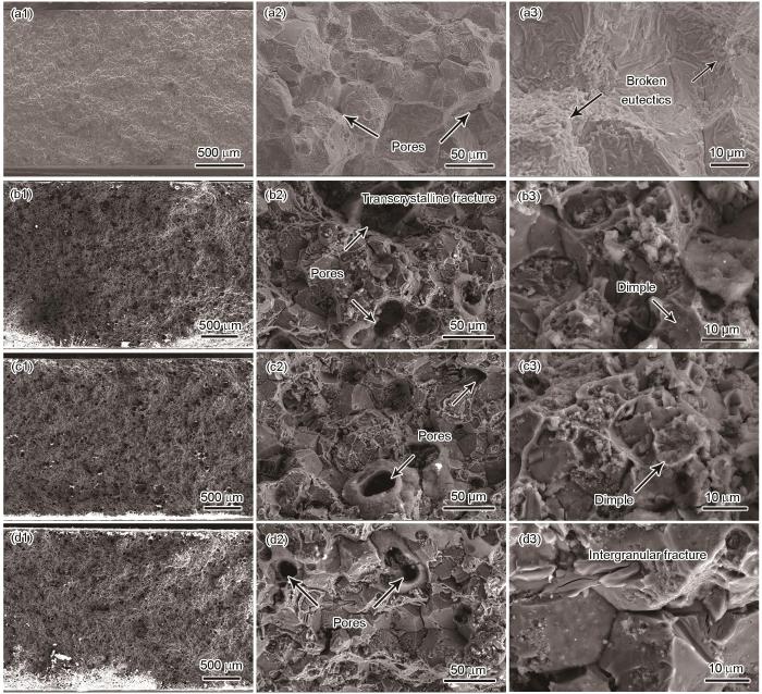 图9显示了沉积态和不同时效热处理时间下Al-Zn-Mg-Cu-Sc合金样品的典型拉伸断口形貌。如图9a1所示,沉积态样品的断裂表面十分平整,放大观察可发现近乎完整的晶粒,表明断裂模式为脆性断裂。同时,在晶界处可以看到许多微小的孔隙和破碎的共晶相特征(图9a2和a3)。当样品受到拉应力时,由于脆性析出相的变形协调性较差,将首先出现微裂纹并沿着晶界扩展,尤其在孔隙较多的区域。对于经过热处理后的拉伸样品,晶界上连续的第二相被溶解,断裂表面观察到明显的凹坑。在时效处理12和18 h的样品表面存在着一些韧窝和破碎的晶粒,表明此状态下的样品塑性较好,断裂模式为韧-脆混合断裂(图9b1~b3和c1~c3)。然而,当时效处理时间增加到24 h时,拉伸样品的断裂表面未见韧窝,显示出完整的等轴晶表面(图9d1~d3),与沉积态样品的断口形貌类似。由于MgZn2相的粗化导致延伸率显著降低,断裂模式转变为脆性断裂。此外,热处理后样品的断裂表面存在较多孔隙,且相比沉积态试样孔隙尺寸明显增加,这将显著影响合金的延伸率。