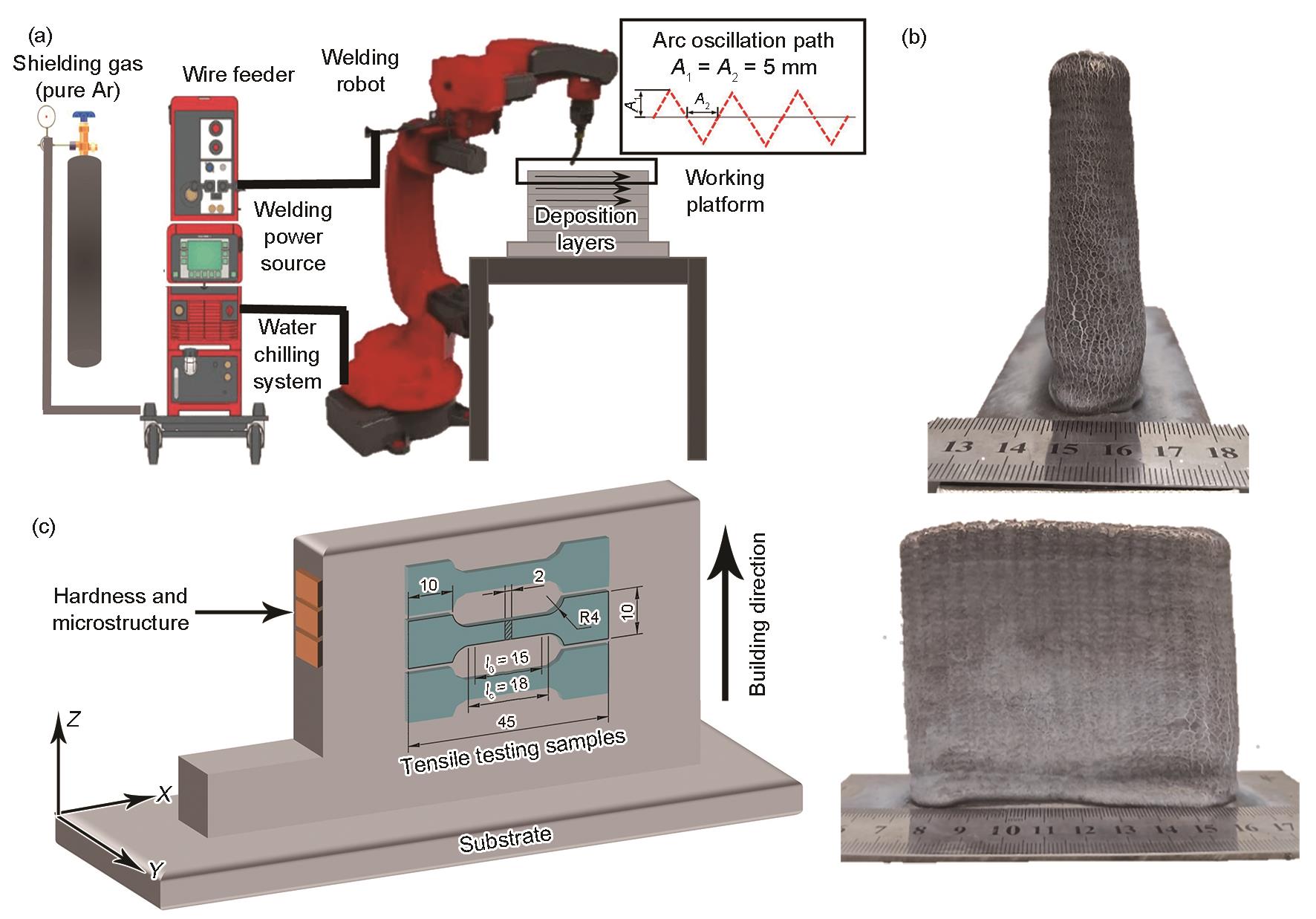 | Fig.1 Schematic of the wire-arc directed energy deposition (DED) process (a), photos of the deposited sample (b), and schematic of the experimental sampling location (unit: mm) (c) (A1—amplitude, A2—length, l0—gauge length, lc—parallel length) |