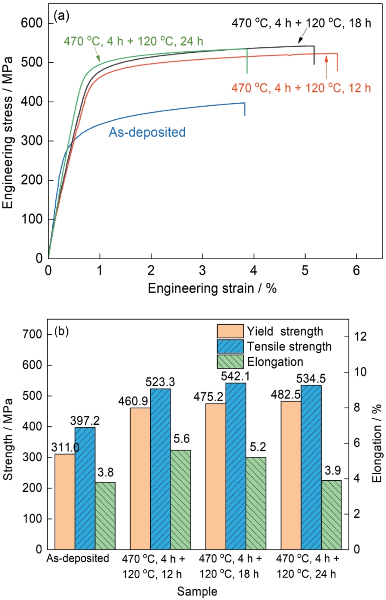 | Fig.8 Engineering stress-strain curves (a) and tensile properties (b) of as-deposited and heat-treated samples with different time |