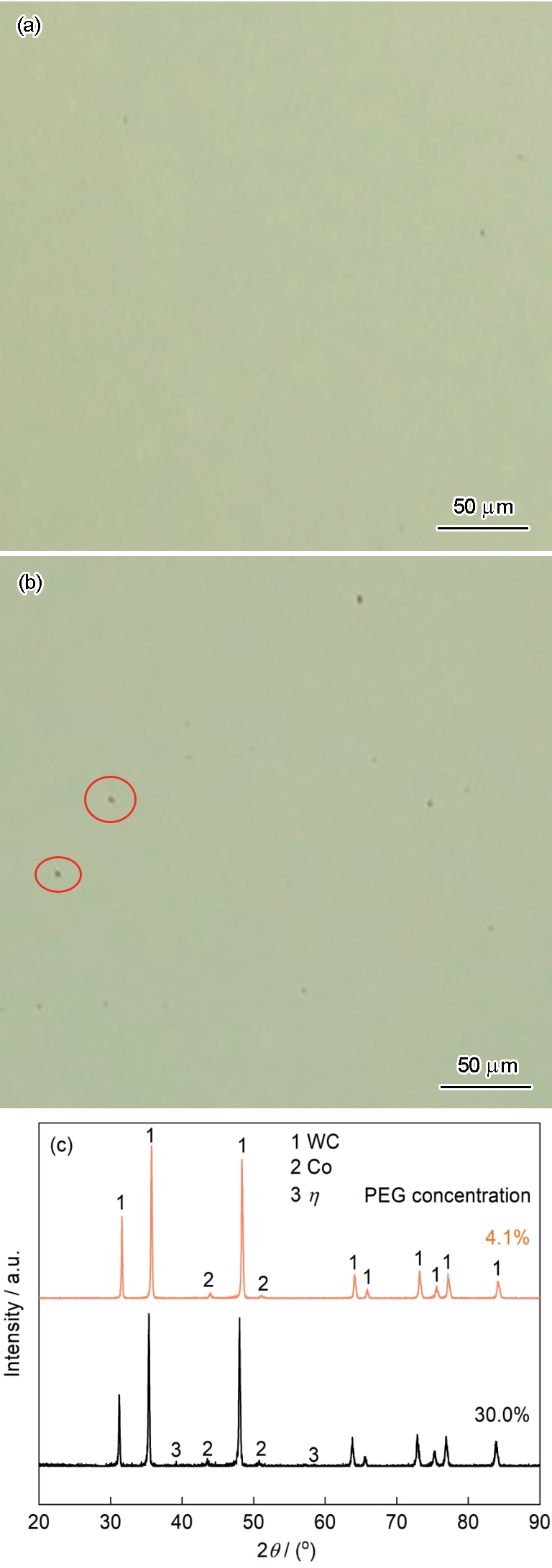 | Fig.5 OM images of the sintered WC-12Co cemented carbides with PEG solution concentrations of 4.1% (a) and 30.0% (b) at PEG content of 1.5%; and corresponding XRD spectra of the cemented carbide (c) (Circles in Fig.5b show the poro-sities) |