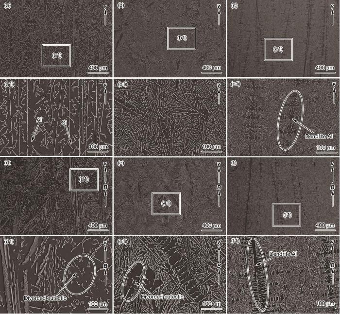 SEM images of the longitudinal section microstructures of Al-12.7%Si alloys directional solidified without or with a high magnetic field and at different solidification velocities (a-f) and corresponding local enlarged images (a1-f1) ( v —growth velocity, B —magnetic flux density)