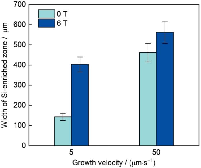 有无磁场和不同凝固速率条件下Al-12.7%Si合金定向凝固过程中固/液界面前沿Si富集区宽度