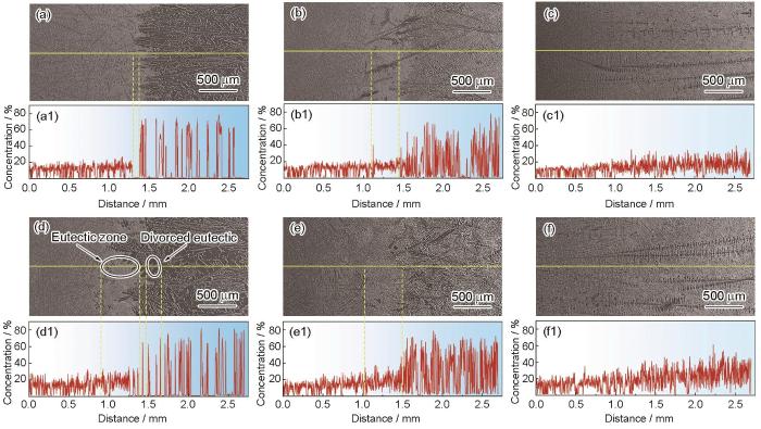 为了进一步探究凝固速率和强磁场对合金凝固过程中溶质迁移行为的影响,利用EPMA对合金淬火组织中的固/液界面处进行了线扫描分析,考察Si元素沿定向凝固方向的成分变化。EPMA检测的位置和结果如图6所示,其中组织图中的黄实线为线扫分析的扫描路径,EPMA线扫图中蓝色背景的深浅程度与Si含量的高低成正比。从图中可以看出,所有条件下Si的含量曲线均呈波动状分布,这是由于不同条件下的合金中含有共晶Si和Al相以及枝晶Al相。在5 μm/s凝固速率下,无磁场时液相区曲线波动较小,Si元素分布相对均匀,而定向生长区成分波动幅度明显,且频率较小(图6a1),证实了该条件下液相成分均匀,凝固的共晶组织较为粗大(图6a)。施加强磁场后,液相区的成分有一定程度波动,而定向生长区的成分波动幅度也较为剧烈,且频率增加明显(图6d1),说明该条件下液相区内溶质分布均匀性变差,也证实了定向凝固区内共晶组织细化明显(图6d)。在50 μm/s凝固速率下,无磁场时液相区曲线分布相对均匀,而定向生长区曲线分布波动幅度较大(图6b1),证实了该条件下液相成分均匀,定向生长区内有大量大尺寸Si相生成(图6b)。施加强磁场后,液相区的成分有一定程度波动,而定向生长区的成分波动较大,波动频率相对较高(图6d1),说明该条件下液相区内溶质分布不均匀,也证实了定向凝固区内组织有一定程度细化(图6d)。凝固速率增大至200 μm/s,相较于5和50 μm/s条件,有无磁场下合金在定向凝固区域的成分曲线波动幅度均明显下降,这是由于线扫描分析主要在共晶组织区域。此外,比较有无磁场下的成分分布曲线可以看出,强磁场的施加使曲线发生了更为明显的波动,说明该条件下合金的液相区成分和定向凝固区组织均匀性有一定程度的降低(图6c和c1,6f和f1)。