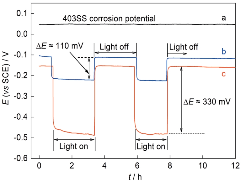 | Fig.8 Potential changes of 403 stainless steel (403SS) under different conditions (Curves a, b, and c represent uncoupled, coupled to the pure TiO2 film, and coupled to the Ag/g-C3N4/TiO2 composite film, respectively, E—potential, ΔE—potential fall) |
