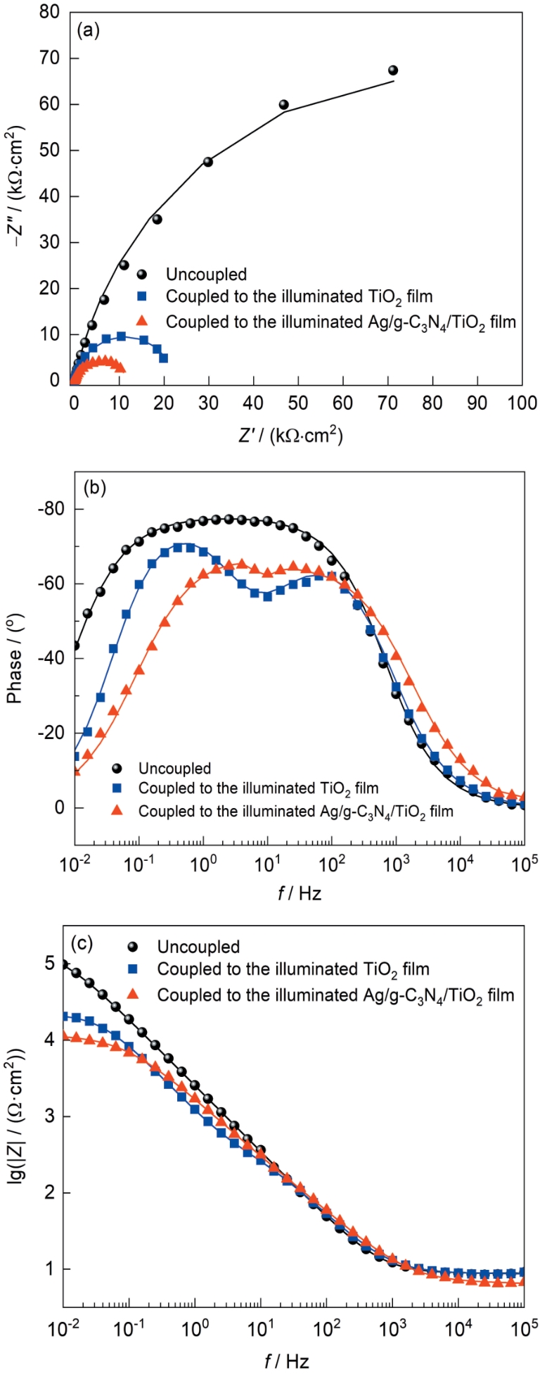| Fig.9 Nyquist plots (a), Bode-phase plots (b), and Bode-modulus plots (c) of 403SS in the 0.5 mol/L NaCl solution under different conditions (Z—impedance,Z'—real component of the impedance, Z"—imaginary component of the impedance, f—frequency) |