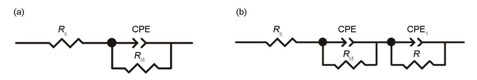 | Fig.10 Equivalent circuit models for 403SS in the 0.5 mol/L NaCl solution (Rs—solution resistance, Rct—charge transfer resistance, R—film resistance, CPE and CPE1—constant phase elements) (a) uncoupled (b) coupled to the illuminated film |