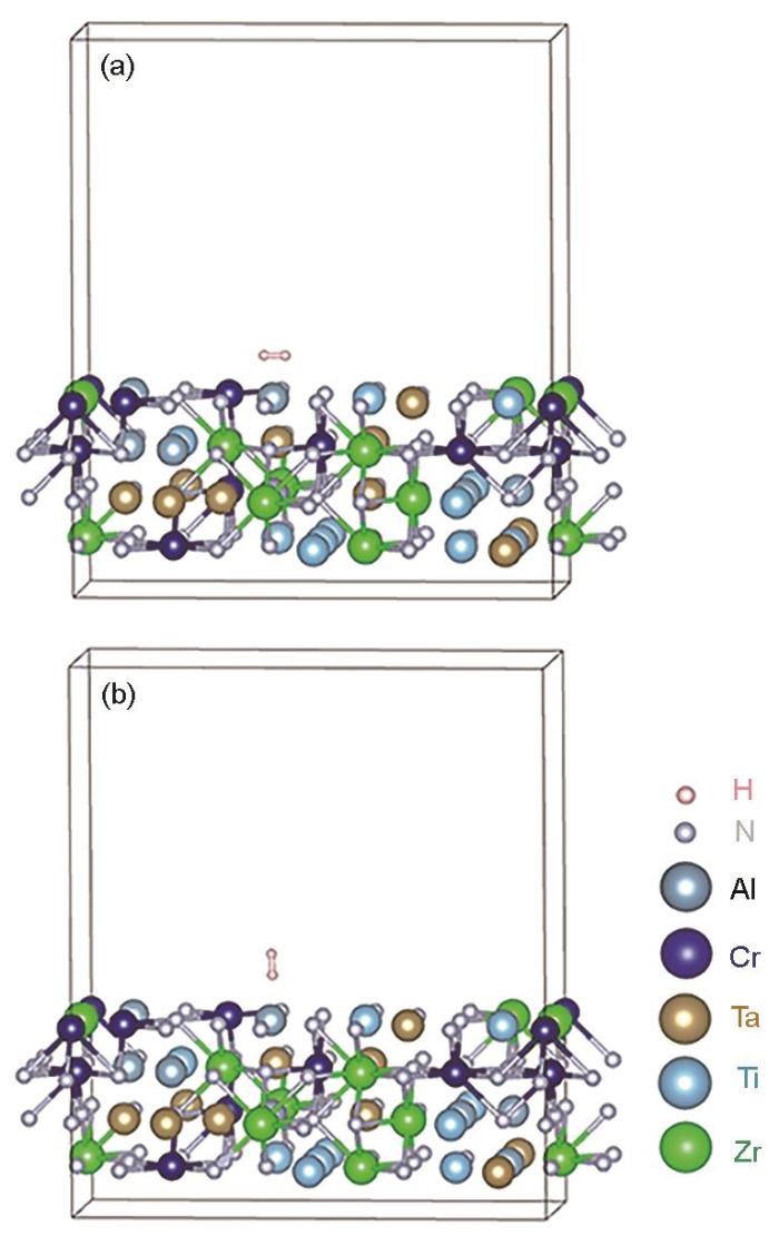 Schematics of parallel adsorption (a) and vertical adsorption (b) of H2 on the surface of (AlCrTaTiZr)N