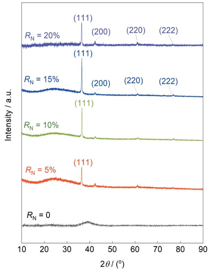 XRD spectra of nitride films at different volume flow rate of N2 (RN—volume flow ratio of N2 / (Ar + N2))