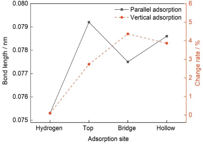 H2 bond length and change rate of H2 before and after adsorption on (AlCrTaTiZr)N (001) surface