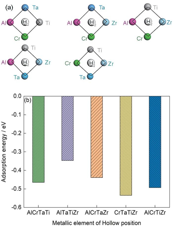 Schematic of vertical adsorption sites (a) and adsorption energies (b) of H2 at different Hollow position on the (AlCrTaTiZr)N (001) plane