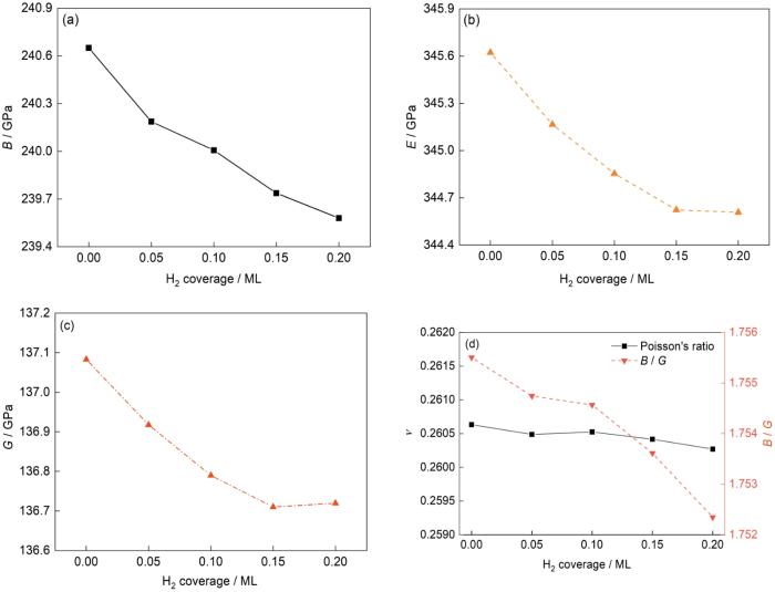 不同H2覆盖度下稳定吸附后涂层的体积模量(B)、Young's模量(E)、剪切模量(G)、Poisson比(