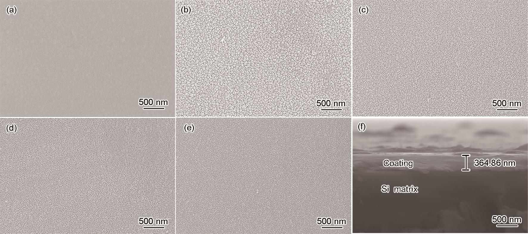 | Fig.6 Surfacial (a-e) and cross-sectional (f) SEM images of nitride films under different N2 flow rates (a) RN = 0 (b) RN = 5% (c) RN = 10% (d, f) RN = 15% (e) RN = 20% |