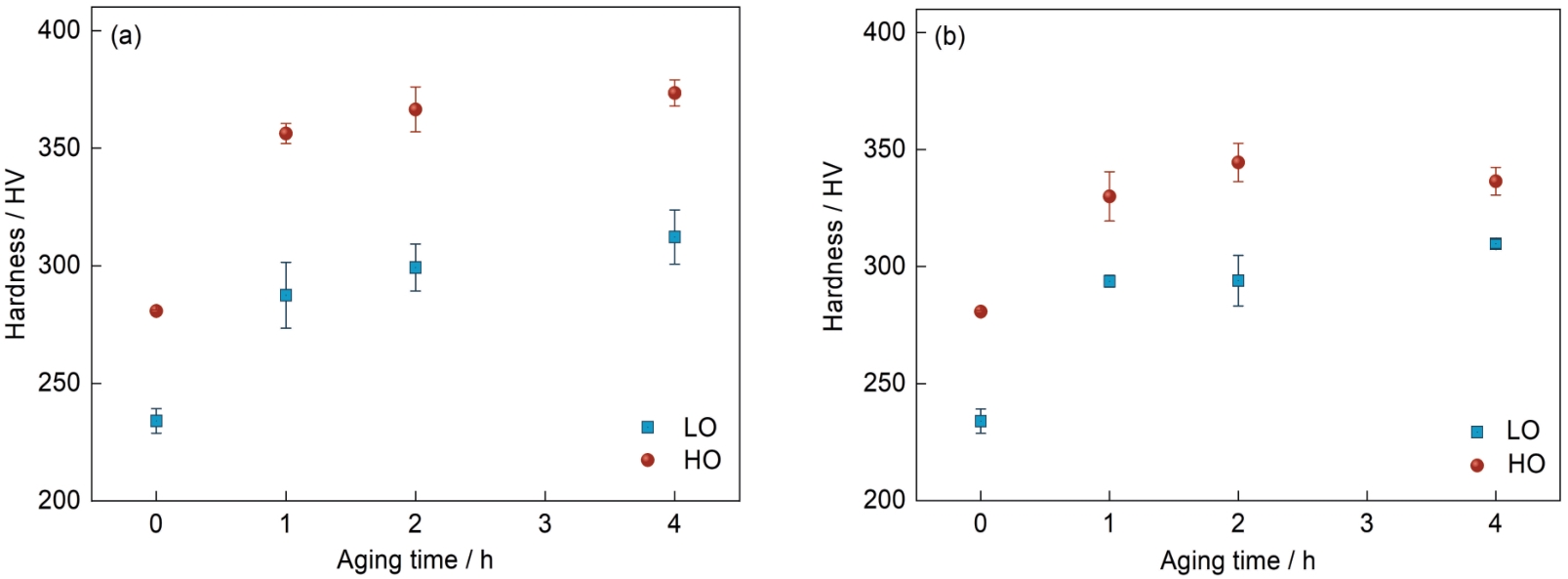 | Fig.14 Evolutions of hardnesses of Ti2448-LO和Ti2448-HO alloys with different heat treatment processes (a) 873 K, 10 min + 773 K, 1-4 h (b) 923 K, 10 min + 773 K, 1-4 h |