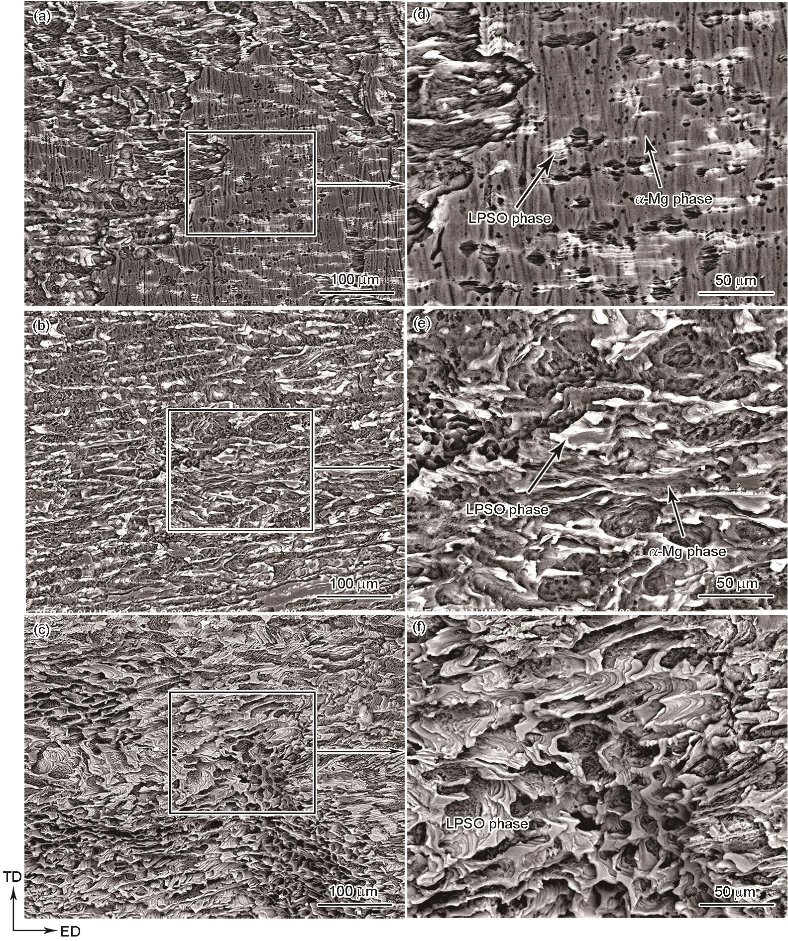 | Fig.10 Low (a-c) and locally high (d-f) magnified SEM images of as-extruded WZ21M (a, d), WZ42M (b, e), and WZ84M (c, f) alloys after immersion in 3.5%NaCl solution for 24 h and subsequently removing corrosion products |