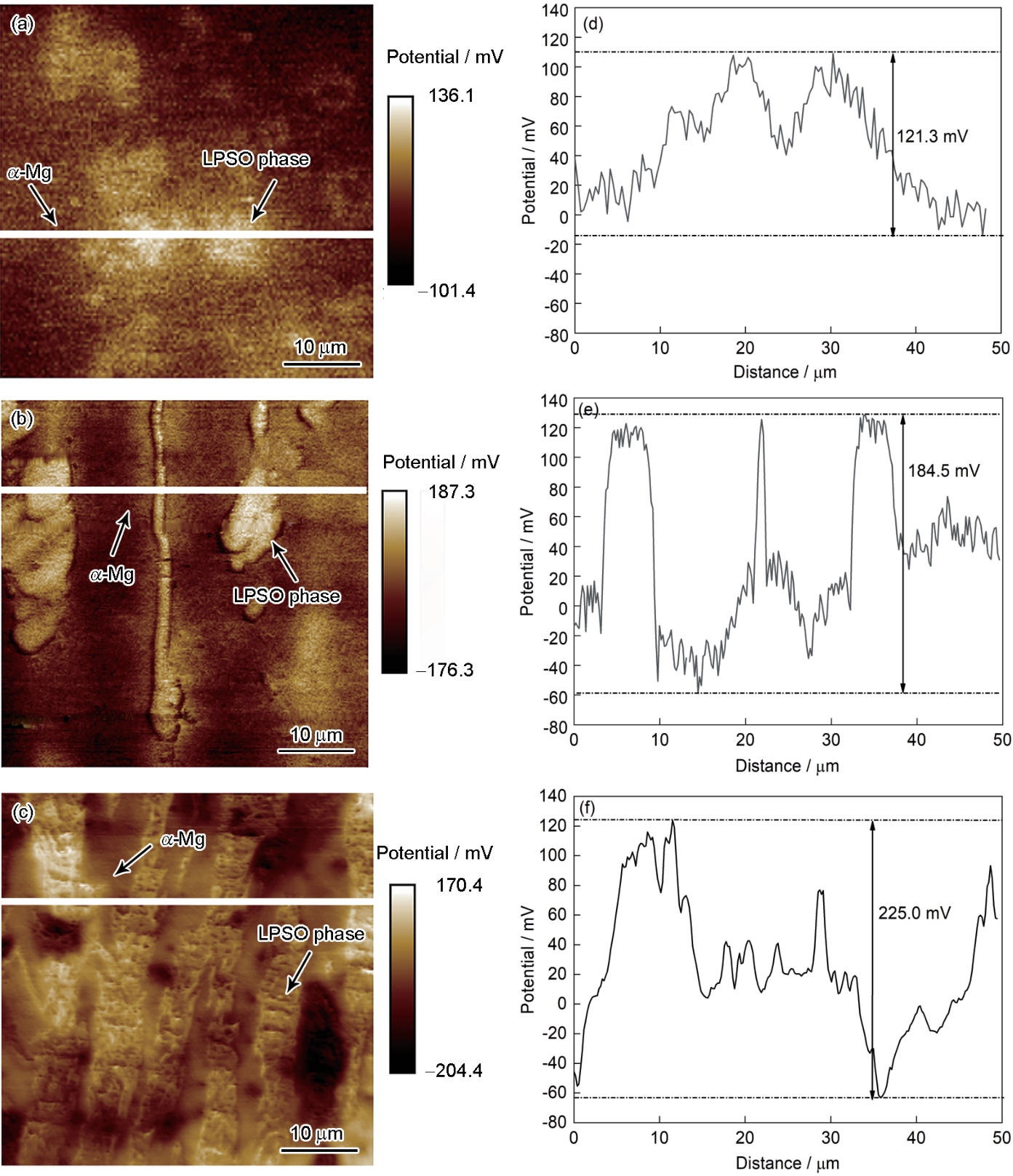 | Fig.13 SKPFM testing results of as-extruded WZ21M, WZ42M, and WZ84M alloys (a-c) potential distribution mappings of WZ21M (a), WZ42M (b), and WZ84M (c) alloys, respectively (d-f) line-profile analyses of relative voltage potential along the white lines in Figs.13a-c, respectively |
