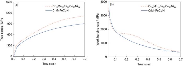 ... 本工作选取的CrMnFeCoNi和Cr26Mn20Fe20Co20-Ni14 HEAs的物理性质(热膨胀、磁性能等)基本一致,2种材料的弹性模量和溶质失配体积也基本相同[22,35],同时2者的晶粒尺寸相当.因此,2种合金可以作为研究堆垛层错能对高熵合金力学响应行为影响的模型材料.上述研究结果表明,CrMnFeCoNi系高熵合金的准静态与动态力学性能随着SFE的变化产生差异(图2~5).在准静态和动态压缩条件下,高熵合金的流变应力、加工硬化率尤其是变形吸能均随着SFE的降低而升高. ...