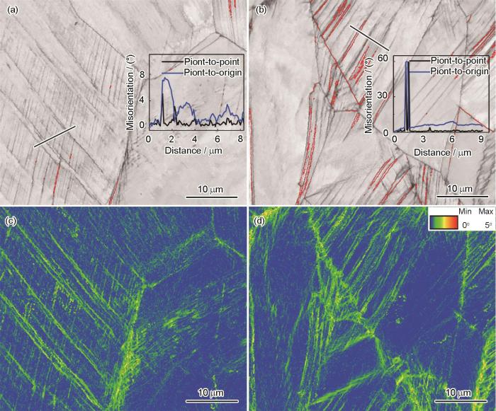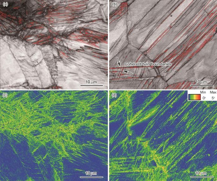 ... [22],变形过程中产生的孪晶数量更多[41] (图7和9).孪生除了通过自身切变协调变形外,变形孪晶还引入新的界面分割晶粒,减小位错运动的平均自由程,产生强烈的细晶强化效应[42,43].变形过程中大量孪晶的启动产生强烈的强化作用,Cr26Mn20Fe20Co20Ni14 HEA的流变应力和加工硬化指数更高,变形过程的吸能更多. ...