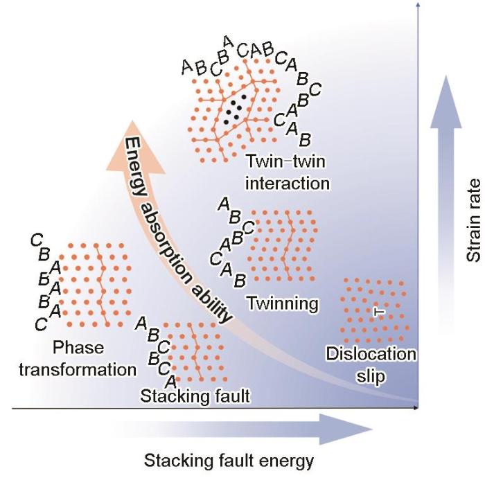 ... 图11总结了堆垛层错能和变形应变率对CrMnFeCoNi系高熵合金变形模式的影响.CrMnFeCoNi系高熵合金的SFE可以通过调整Cr和Ni在一定范围内的含量而改变,而且成分上的变化不会改变其他的物理性能[35].降低Ni元素的含量,材料的SFE随之降低,材料的变形模式从位错滑移为主(图7a)转为变形孪生为主(图7b),最后转为相变诱导塑性(TRIP)[22,45].增加应变率也可以促进变形模式的改变[10,46].应变率较低时,材料变形主要以位错滑移为主(图7a);应变率增加,孪生活动更加剧烈(图9a),对材料变形的贡献增加.而且,在高应变率加载时,具有低SFE的Cr26Mn20Fe20Co20Ni14 HEA变形组织中出现孪晶交互作用(图9b)和相变(图10d1和d2).孪生和相变对CrMnFeCoNi系高熵合金变形的贡献与低SFE的TWIP/TRIP钢(TWIP—孪生诱发塑性)[47,48]、铜合金[49,50]和Ni-Co基合金[51]的TWIP/TRIP效应相同.降低SFE可影响材料的变形协调方式,促进材料中的TWIP/TRIP效应,孪生以及相变成为重要的变形协调方式.因此,通过适当改变合金中Cr和Ni的含量来调整材料CrMnFeCoNi系高熵合金的SFE,可调控变形过程中的TWIP/TRIP效应,提升材料的动态力学性能(强度、韧性和加工硬化能力)和吸能能力. ...