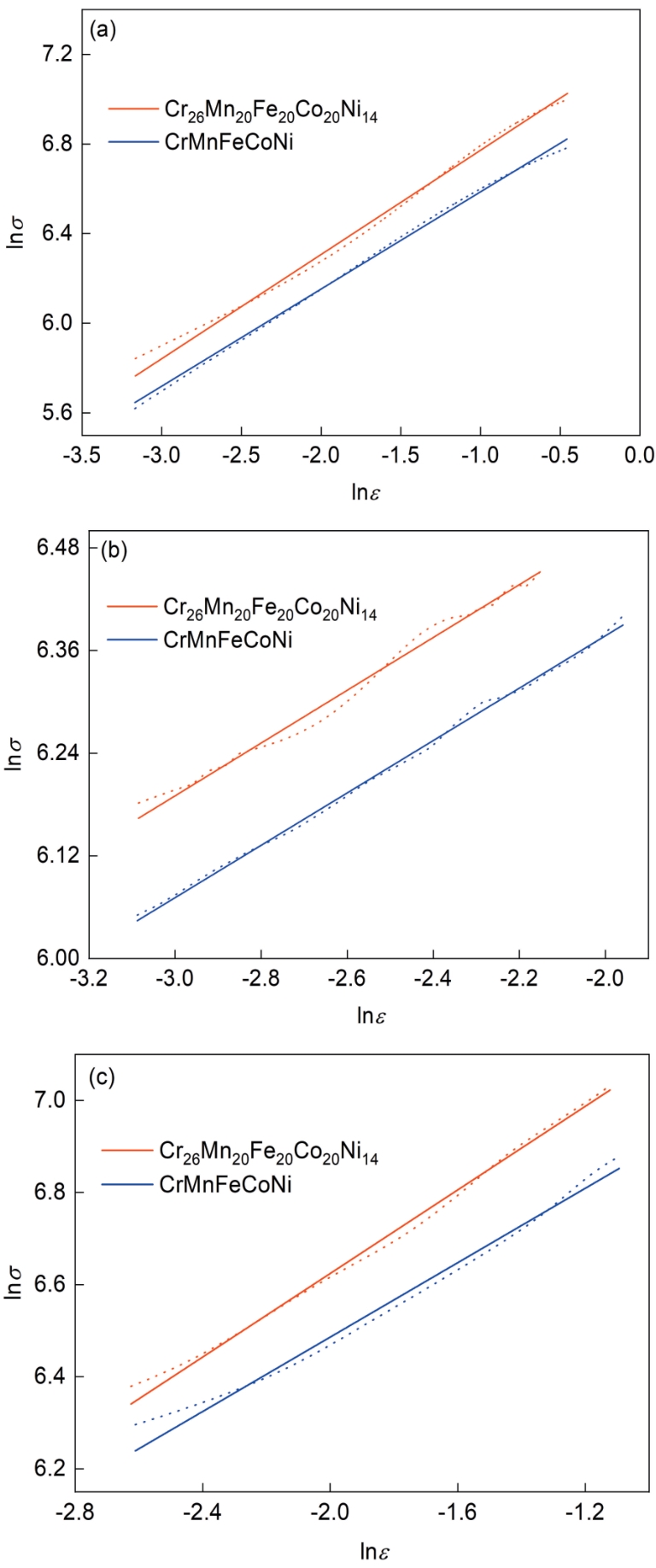 | 图4 变形应变率为1 × 10-3、2 × 103和5 × 103 s-1时CrMnFeCoNi和Cr26Mn20Fe20Co20Ni14高熵合金 |