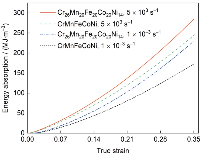 | 图6 CrMnFeCoNi和Cr26Mn20Fe20Co20Ni14高熵合金的吸能特性 |