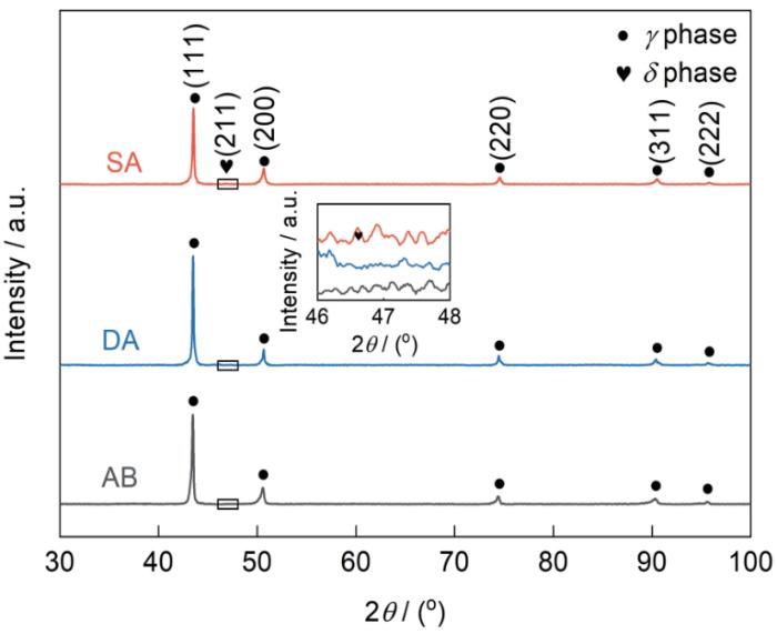 ... 图3为GH4169高温合金AB、DA和SA试样的XRD谱.AB、DA和SA试样主要由奥氏体相组成,其中(111)晶面衍射峰强度最高.插图为2θ在46°~48°的局部放大图,其中SA试样有δ相的(211)晶面衍射峰,但衍射峰强度较弱,说明δ相的相对含量较少.根据图3计算γ相衍射峰的晶面间距,结果如表2所示.热处理后晶面间距减小,这是由于热处理后γ′/γ″相析出,γ′/γ″相与γ基体的衍射峰角度相近,但γ′/γ″相的晶胞参数小于γ基体[31],所以热处理后晶面间距减小.在相同外应力的作用下,晶面间距减小,位错运动更难进行[32]. ...