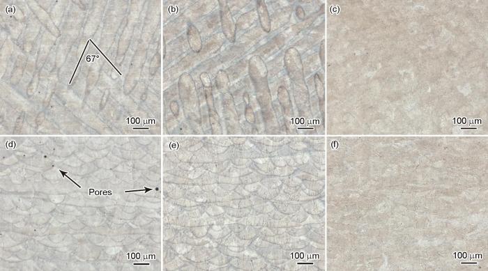 ... 图7为GH4169高温合金AB、DA和SA试样的反极图(IPF)面分布图,图7a~c为XOY面,图7d~f为XOZ面.热处理后晶粒形貌变化不明显,晶粒随机取向,无明显织构.SLM成型样品晶粒与锻件均匀等轴晶粒[34]不同,其中XOY面晶粒呈等轴状,XOZ面晶粒呈柱状,并与构建方向平行,XOY面和XOZ面大晶粒周围均分布有细小的晶粒. ...