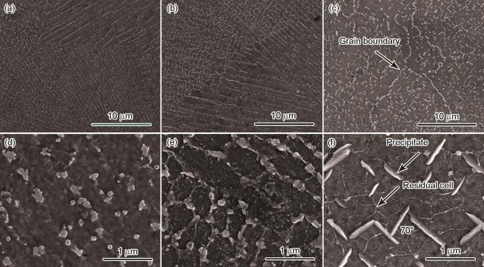 ... 图5为GH4169高温合金AB、DA和SA试样显微组织的SEM像.由图5a和d可以看到,SLM成型GH4169试样的组织均匀、细小,具有胞状和柱状晶组成.如图5b和e所示,DA试样的胞状和柱状结构依然存在,内部有颗粒状析出物,平均尺寸约20 nm.图5c和f显示,SA试样中的胞状和柱状结构基本消失,在晶内和晶界均有片状或针状析出物,长度约1 μm,这些片状析出物呈一定角度(约70°)均匀分布在基体中,与立方晶体{111}中晶面夹角为70.53°相接近[33],基体内部有与DA试样相似的颗粒状析出物. ...