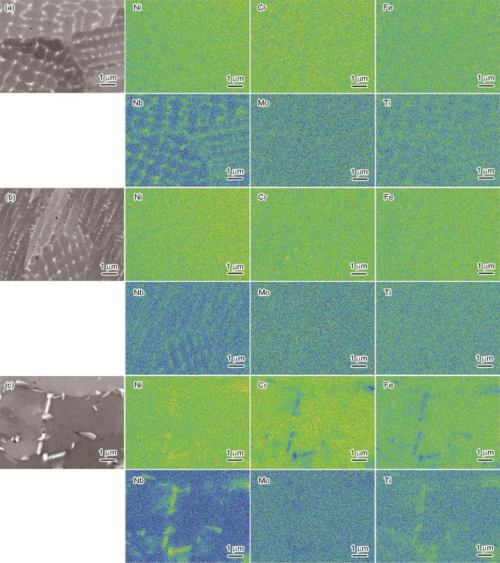 ... SA处理后,如图13k、m、o所示,与DA试样相同,在基体析出细小的γ′/γ″相,并与基体完全共格,同时发现在晶内和晶界有大量短棒状析出相,980 ℃固溶温度在δ相析出的温度区间内[22],δ相为正交结构,结构式为A3B,晶胞参数a、b、c均不相等,δ相有12种变体[48],在基体[110]带轴下观察到基体与δ相的取向关系:[110] γ // [100] δ,[110] γ // [102] δ.结合图12 EDS结果,可以确定为Ni3(Nb, Ti).黄文普[3]通过差示扫描量热仪(DSC)测量Laves相初始溶解温度为825 ℃,远低于传统制造1140~1160 ℃[49]的初熔温度.此固溶温度下Laves相有更快溶解动力[50],低温溶解现象与SLM成型GH4169的高位错密度和精细微观组织密切相关.在Laves相溶解过程中,由于SLM成型高冷却速率导致组织中枝晶间距十分细小,初始偏析程度较低,扩散距离较短,同时δ和γ″两相的析出降低了基体中Nb元素含量,进一步促进了Laves相的溶解,因此实验中并未发现明显的Laves相残留. ...