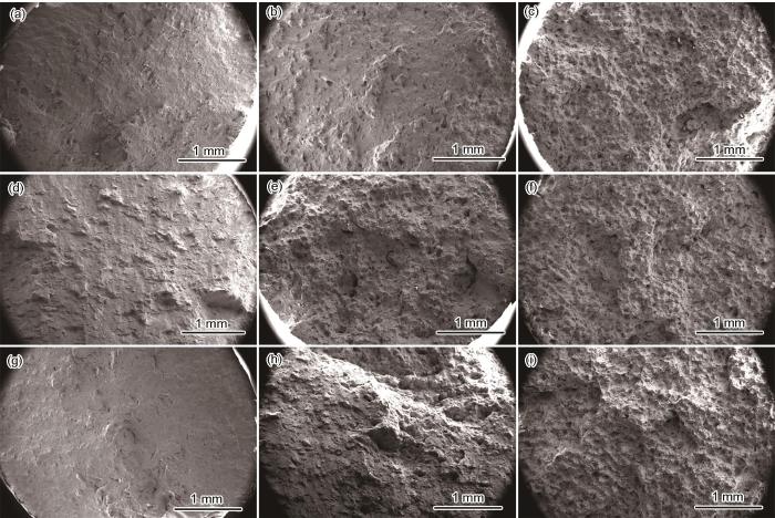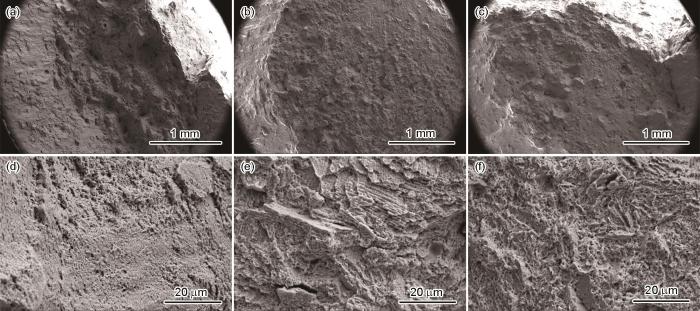 ... 图8为GH4169合金AB、DA和SA试样的室温拉伸断口形貌.低倍观察时均可见台阶解离面,DA和SA试样断面较AB试样更加平整,AB试样有空洞分布在中心区域.高倍下观察时均可见韧窝形成,断裂方式为韧性断裂,AB试样的韧窝较浅,2种热处理态试样的拉伸断口韧窝较深且密集,说明在拉伸过程中承受较高的载荷,表现出较高的抗拉强度及屈服强度,这可归因于晶粒内析出相与位错之间复杂的交互作用.图8e和f显示,热处理态试样内部均发现有裂纹,在晶界附近的裂纹由于应力集中被撕裂,DA试样有明显剪切韧窝(图8e),一般分布在试样边缘由剪切应力切断[36]. ...