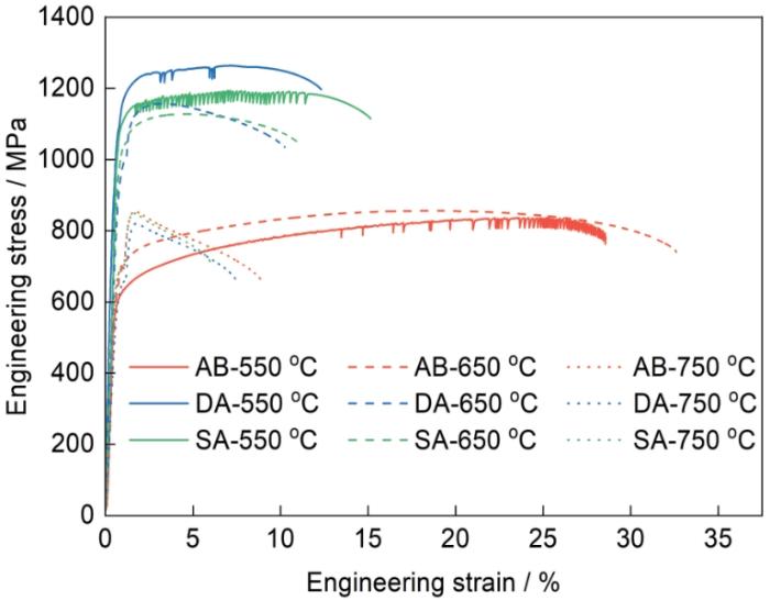 ... 550 ℃下拉伸性能与室温性能趋势相一致,DA试样的强度最高,AB试样的断后伸长率最高,但整体强度较室温时下降了10%~14%,断后伸长率减少了3%~4%.650 ℃高温拉伸时锯齿现象消失,DA和SA试样的强度高于锻件650 ℃高温拉伸性能标准要求,与室温强度相比下降20%,断后伸长率低于锻件标准要求(具体数值见表5).值得注意的是,AB试样在650 ℃下的拉伸性能与550 ℃相比有所提高.当测试温度达到750 ℃时,3种状态拉伸曲线趋于一致,呈明显的脆性断裂,强度和塑性显著下降.由于γ″为亚稳态相[43,44],在高于650 ℃时会转变为δ相,γ″共格强化减弱.此外,750 ℃会促进O2沿晶界扩散[45],裂纹扩展速率更快,造成力学性能恶化. ...
