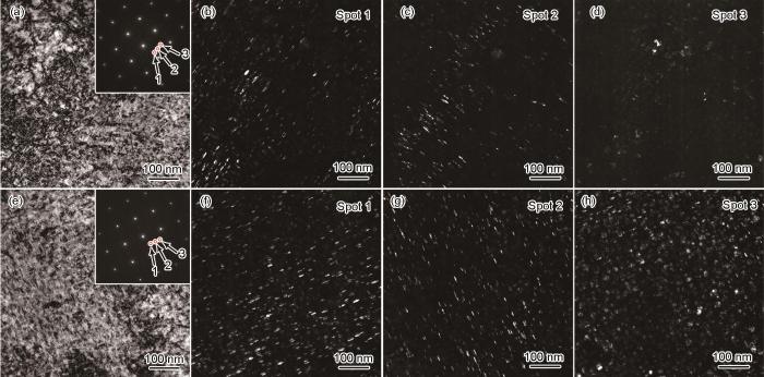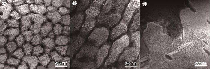 ... 为进一步明确析出相结构及其演变规律,对试样进行TEM观察.图11为AB、DA和SA试样胞状结构的TEM明场像.可见,AB样品中有大量位错(图11a),并在胞状边界缠绕,位错的滑移使其具有较高的断后伸长率,在胞壁节点处有不规则块状析出相.DA样品中的胞状组织依然存在(图11b),胞内有细小的析出相生成,由于胞内析出相的阻挡,位错滑移较难进行,强度大幅提高,但塑性下降.SA样品中的胞状组织完全消失(图11c),位错不明显,在晶内和晶界有片状或短棒状析出相生成,位于边界的析出相可作为裂纹萌生的起点[46],同时基体内存在细小的析出相. ...