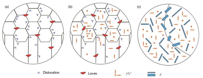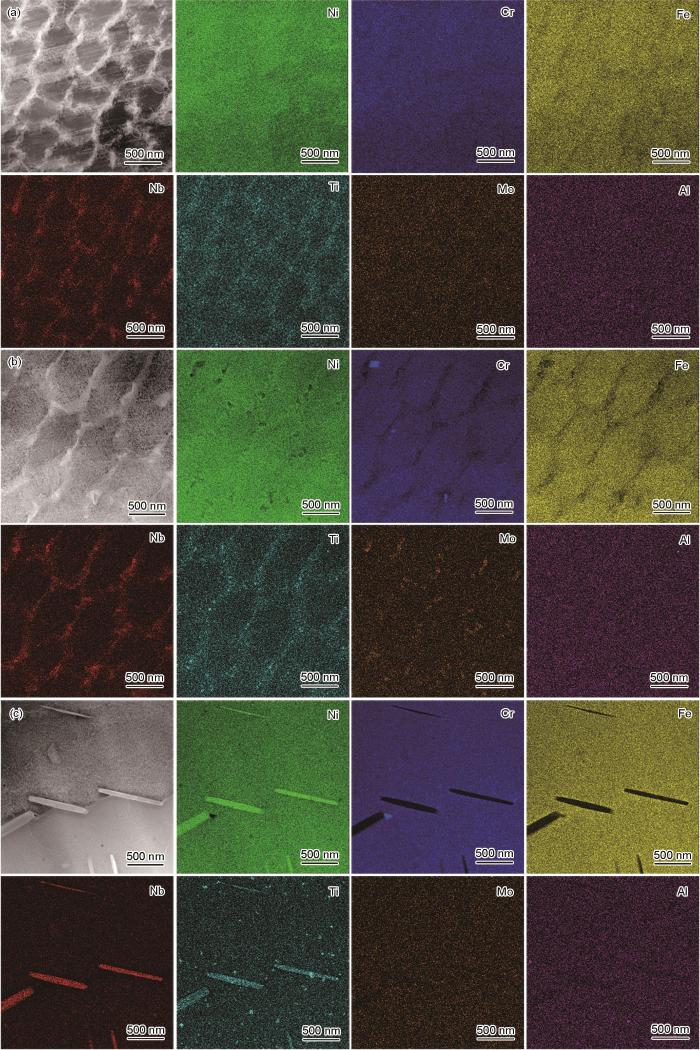 ... DA处理后,如图13g所示,在基体内部有细小的短棒状析出相,在[100]带轴下获得具有γ′和γ″的超点阵,经过标定,基体与γ′/γ″相完全共格,与基体取向关系为:[100] γ // [100] γ′ // [100] γ″,一般认为沉淀析出过程中,会先析出γ′相,然后随着时间的延长,γ′周围有片状γ″相析出,当γ′尺寸合适时,γ″会在γ′相周围6个面成立方体式包覆[47].若γ′尺寸小于临界尺寸,由于Nb元素的消耗,会形成单个或层状γ″相.同时在晶界交界处发现Laves相,说明时效过程并不能使Laves相溶解,测试过程中发现DA试样中某些Laves相与基体的取向关系发生偏转,这可能与γ′/γ″析出相的形成导致基体与Laves相界面发生改变有关. ...