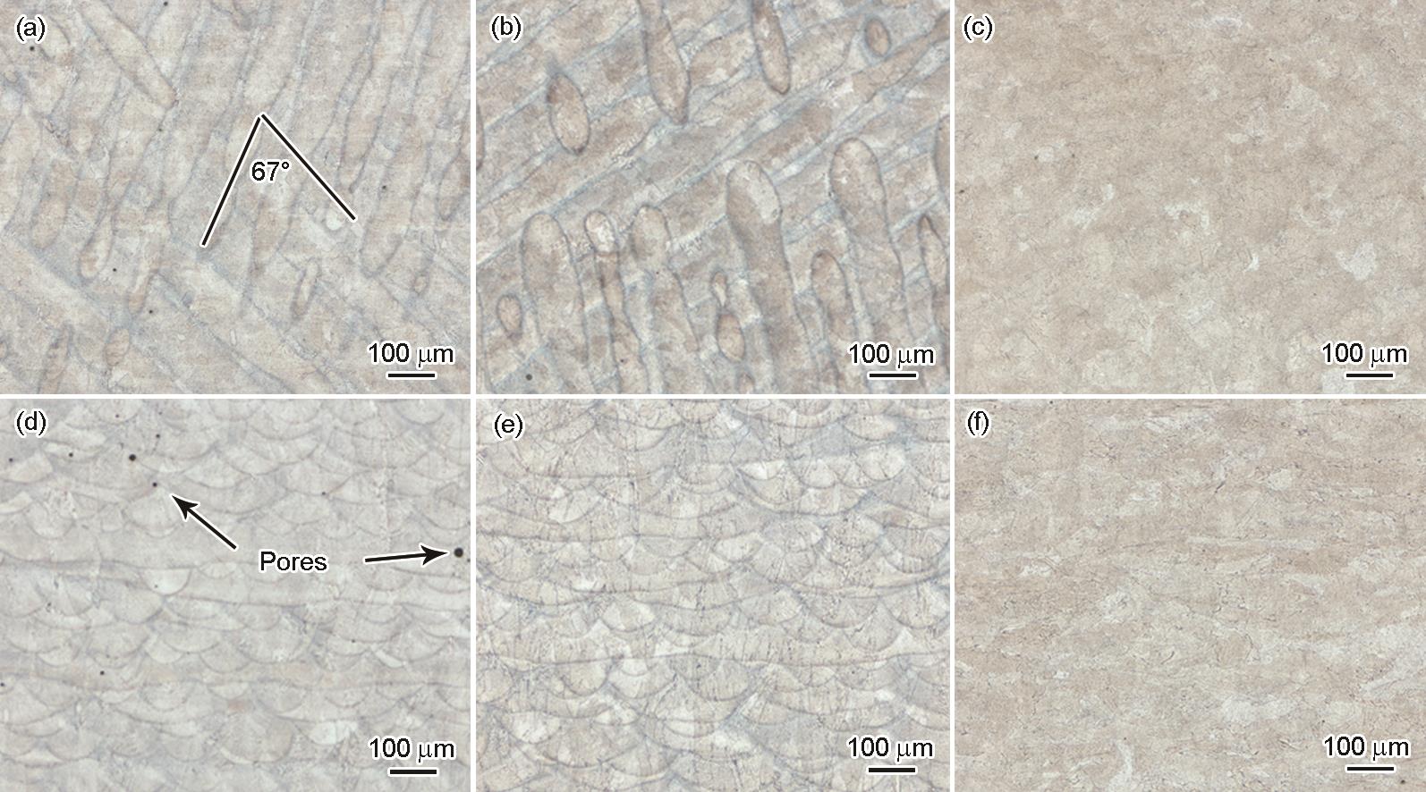 | Fig.4 OM images of GH4169 superalloy specimens in different states at the XOY surface (a-c) and XOZ surface (d-f) (a, d) AB state (b, e) DA state (c, f) SA state |