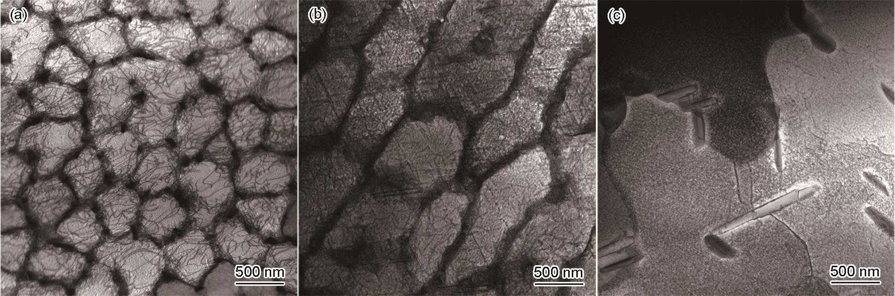 | Fig.11 TEM bright-field images of cellular structures of GH4169 superalloy specimens in AB (a), DA (b), and SA (c) states |