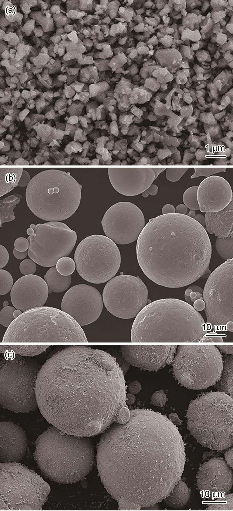 | Fig.1 SEM images showing the powder morphologies of TiC (a), GH4975 (b), and TiC mixed with GH4975 (c) |