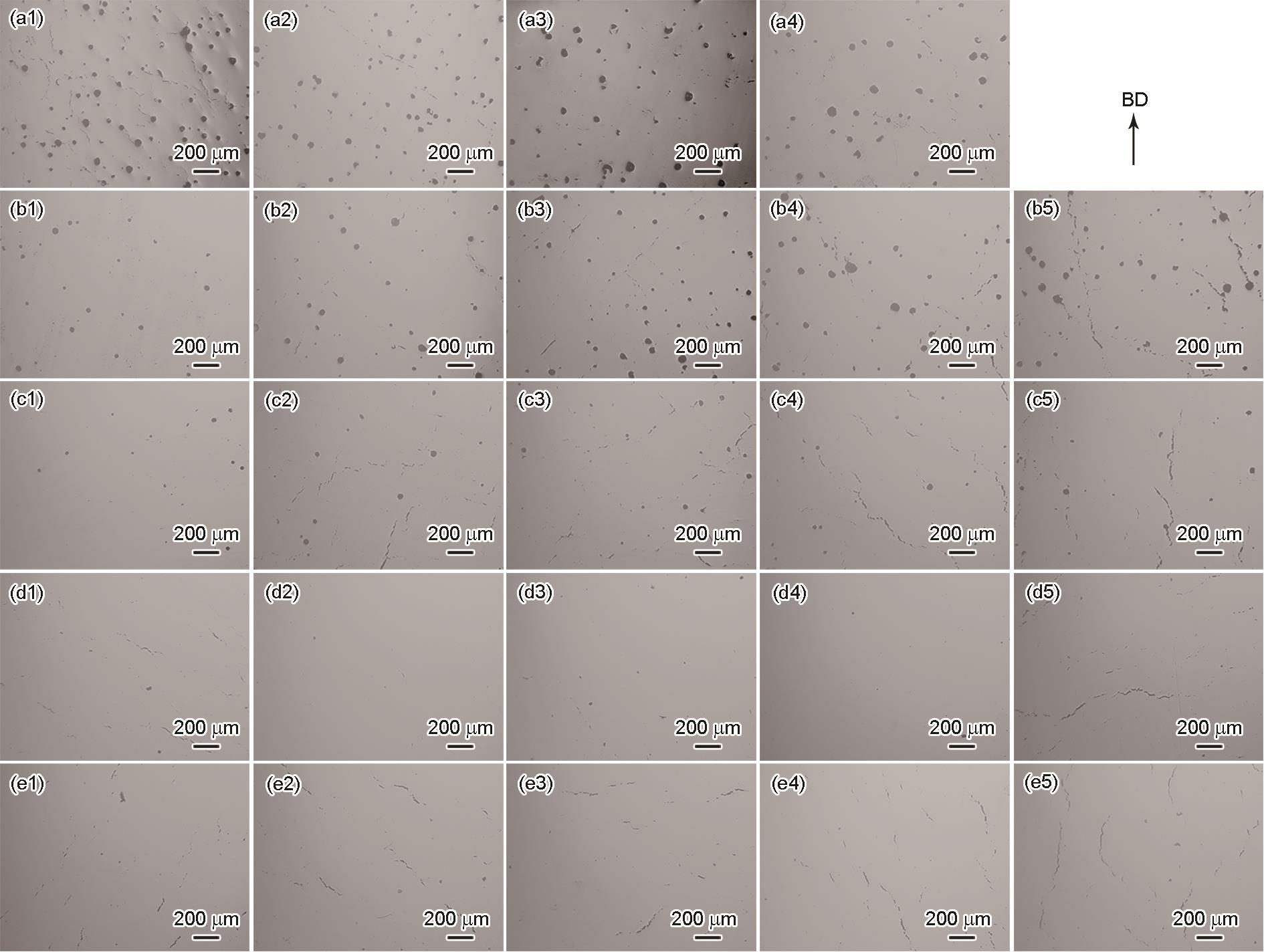 | Fig.2 OM images of as-build GH4975 samples under laser powers of 160 W (a1-e1), 180 W (a2-e2), 200 W (a3-e3), 220 W (a4-e4), 240 W (b5-e5) and scan rates of 400 mm/s (a1-a4), 500 mm/s (b1-b5), 600 mm/s (c1-c5), 700 mm/s (d1-d5), 800 mm/s (e1-e5) (BD—building direction. Printing was terminated due to severe warping at laser power 240 W and scan rate 400 mm/s) |