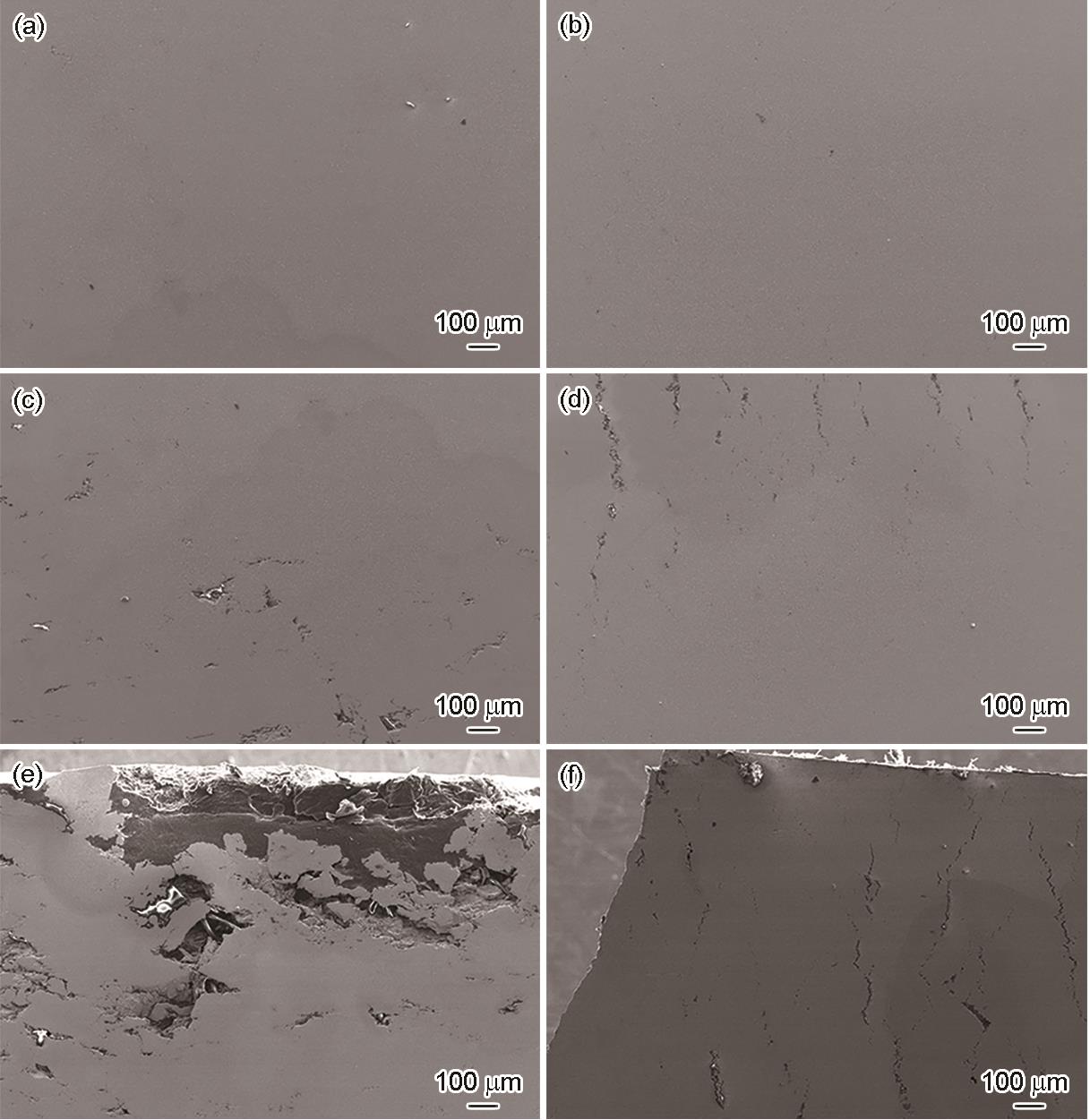 | Fig.7 Cross-sectional SEM images of TiC-GH4975 HIPed samples after hot compression at 1160 oC (a, c, e) and 1200 oC (b, d, f) in the center (a, b), near the end face (c, d), and in the end face (e, f) |
