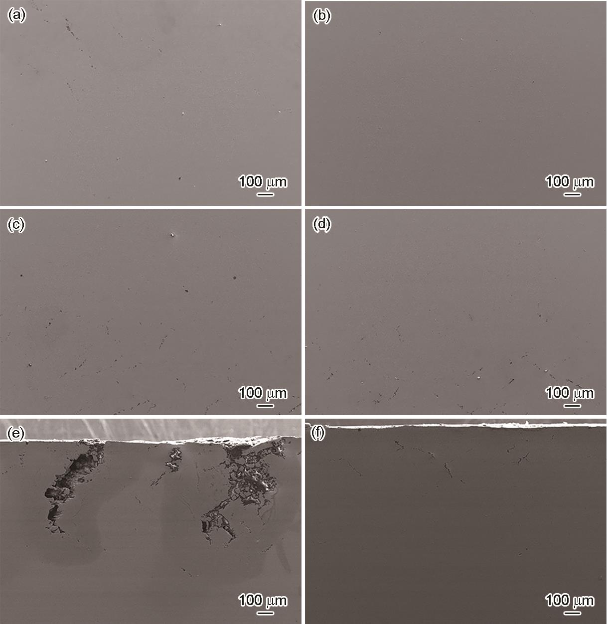 | Fig.8 Cross-sectional SEM images of TiC-GH4975 as-build samples after hot compression at 1160 oC (a, c, e) and 1200 oC (b, d, f) in the center (a, b), near the end face (c, d), and in the end face (e, f) |