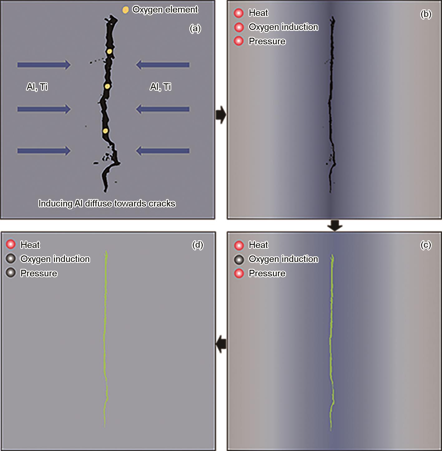 | Fig.12 Schematics showing the mechanisms of crack healing during HIP (Blue indicates the enrichment level of Al and Ti elements, red point highlights represent the primary factors influencing the change in this step, gray point highlights denote non-primary factors) (a) crack morphology and element diffusion trend (b) crack healing caused by heat and pressure, elements gather at the crack due to oxygen induction (c) crack healing is completed (d) elements diffuse back to the matrix caused by heat |