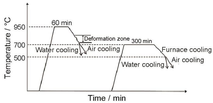 实验原材料为T8珠光体共析钢热轧板,尺寸为150 mm × 50 mm × 30 mm,其化学成分(质量分数,%)为:C 0.790,Si 0.259,Mn 0.354,P 0.003,S 0.004,Fe余量。形变球化工艺采用锻造和热处理相结合来实现基体强韧化和渗碳体球化,具体通过对锻造温度、保温时间、变形量、锻后冷却方式、球化温度、保温时间和球化后冷却方式等参数进行设计优化来获得预期组织,形变球化工艺示意图如图1所示。具体步骤如下:将尺寸为150 mm × 50 mm × 30 mm的T8钢样品在950 ℃下保温60 min,以获得全奥氏体的高温组织,随后将加热后的样品沿厚度方向单向变形,变形温度范围为830~750 ℃ (T8钢冷却时奥氏体向珠光体转变的起始温度Ar1 = 730 ℃,淬火时马氏体转变的起始温度Ms = 220 ℃),在整体变形量达到80%后,将变形后的材料分别以空冷或水冷2种方式冷却至室温。之后对锻后钢样在700 ℃进行球化处理,保温300 min后随炉冷却到500 ℃后再分别空冷或水冷至室温。最终获得不同形变球化工艺参数的样品编号如表1所示。