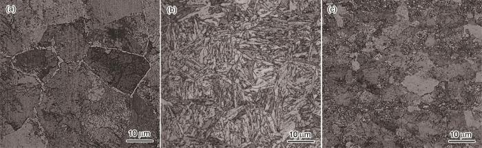 图3为T8钢原始组织及经锻造后水冷和空冷的显微组织的OM像。T8钢原始组织为典型的片层珠光体,其晶粒较为粗大,采用截线法测量的平均晶粒尺寸约为36.26 μm。相比之下,锻造后显微组织发生了转变,且2种冷却方式获得的组织差异较大。水冷组织转变为片状马氏体,而空冷组织则保留着片层珠光体,但其晶粒尺寸明显细化,平均晶粒尺寸约为7.37 μm。采用锻后水冷时,由于冷却速率大于形成马氏体的临界冷速,高温奥氏体在经历锻造变形后的快冷过程中直接发生无扩散相变,转变为片状马氏体,这种组织具有很高的强度和硬度。而对于空冷样品,高温奥氏体变形后慢冷时发生共析反应转变为片层珠光体,由于奥氏体区变形的作用,奥氏体晶粒内部残留大量应变,使得最终形成的珠光体晶粒明显细化。